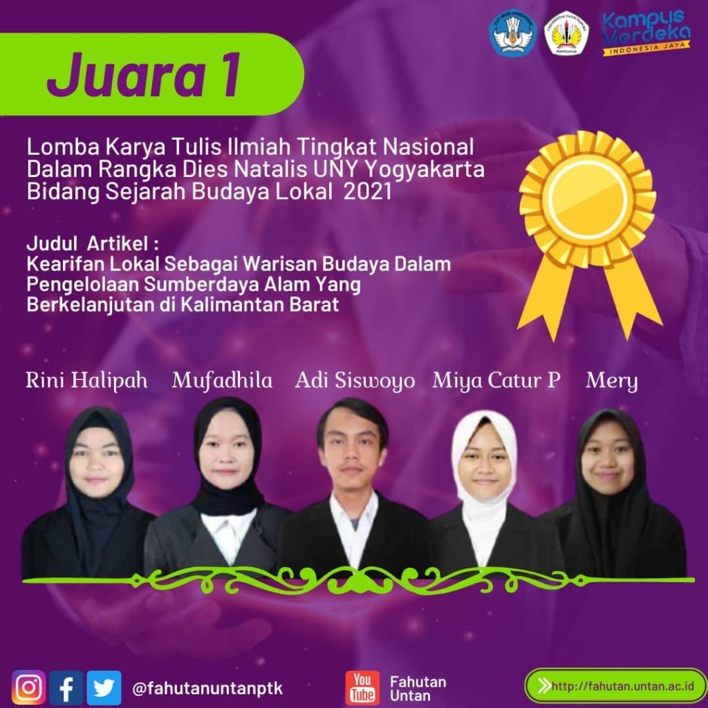 Dekan dan Seluruh Sivitas Akademika Fakultas Kehutanan UNTAN Mengucapkan SELAMAT DAN SUKSES Kepada tim mahasiswa yang beranggotakan Rini Halipah, Mufadhila, Adi Siswoyo, Miya Catur P, dan Mery, atas prestasi gemilang meraih Juara 1 Lomba Karya Tulis Ilmiah (LKTI) Tingkat Nasional dalam rangka Dies Natalis Universitas Negeri Yogyakarta (UNY) 2021. Tim ini berhasil meraih posisi puncak