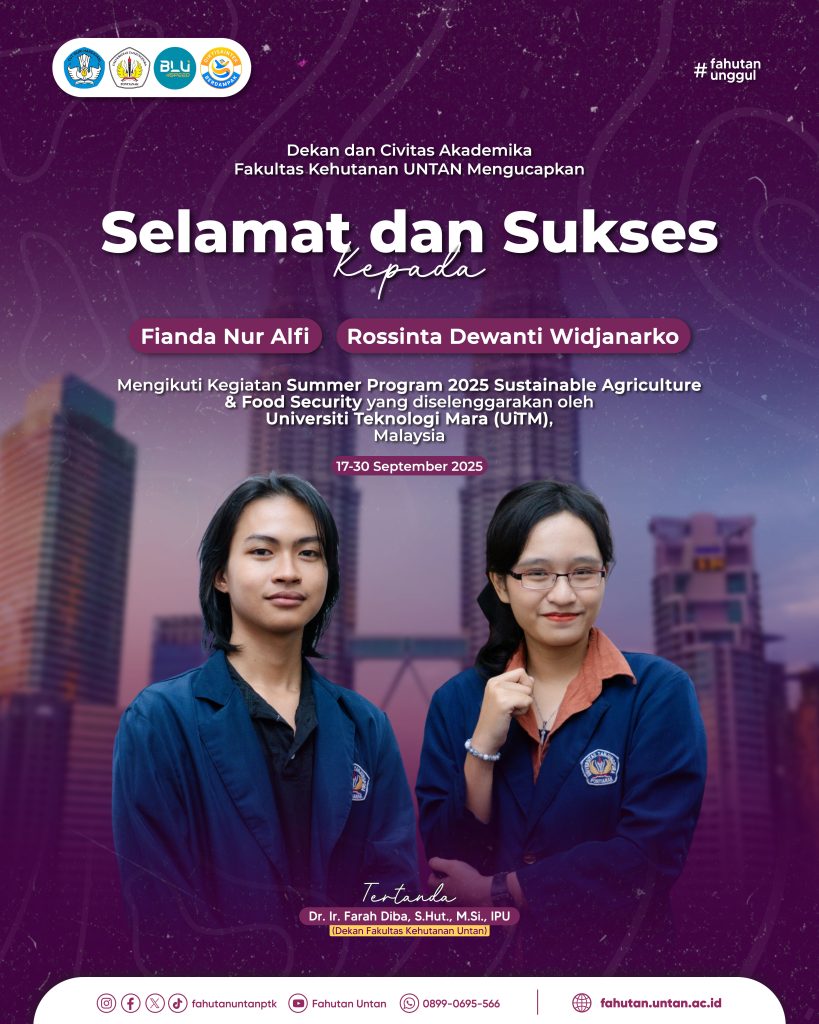 Selamat dan Sukses Kepada Fianda Nur Alfi dan Rossinta Dewanti Widjanarko atas partisipasinya dalam Summer Program 2025 Sustainable Agriculture & Food Security yang diselenggarakan oleh Universiti Teknologi Mara (UiTM), Malaysia pada 17–30 September 2025. Semoga pengalaman berharga ini menjadi bekal untuk terus berkarya, menginspirasi, serta membawa nama baik Fakultas Kehutanan Universitas Tanjungpura di kancah internasional