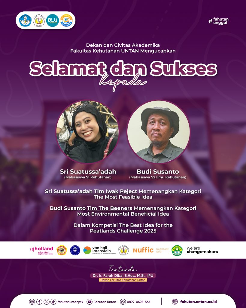 Dekan dan segenap Civitas Akademika Fakultas Kehutanan Universitas Tanjungpura Mengucapkan Selamat dan Sukses kepada Sri Suatussa’adah (Mahasiswa S1 Kehutanan) dan Budi Susanto (Mahasiswa S2 Ilmu Kehutanan) atas prestasi gemilang dalam kompetisi The Best Idea for the Peatlands Challenge 2025. Sri Suatussa’adah bersama Tim Iwak Peject sebagai pemenang kategori The Most Feasible Idea dan Budi Susanto